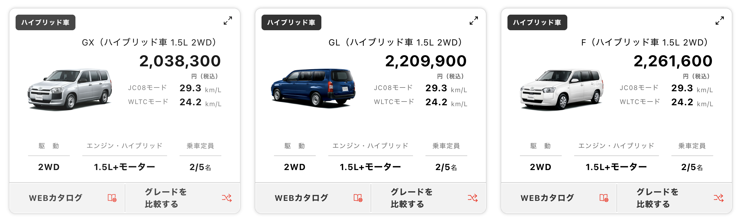 TOYOTA ProBox Hybrid(Hybrid)には3つのグレードがあって、最も安いGXグレードと最も高いFグレードの違いについてチェックしてみましょう。GXグレードとFグレードの差額は223,300円になりますが、どのグレードが総合的に考えてお得なのか。