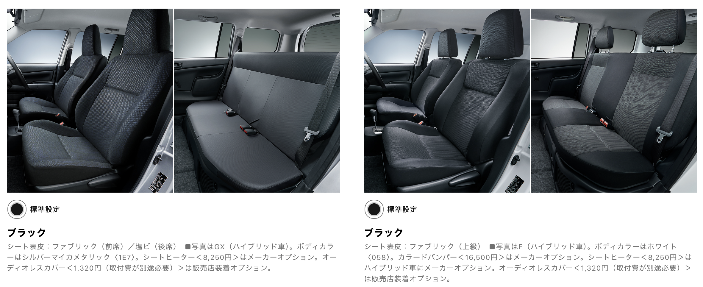 シートは前席がFグレードの場合、上級ファブリックになってヘッドレストが分離式になります。そして最大の特徴が後部座席のシートがFグレードの場合はヘッドレスト付きのファブリック仕様となる点ですね。GXグレードの後部座席はヘッドレスト無しの薄い座席になります。(ただし、GXグレードでも14,300円のメーカーオプションで後部座席をFグレードと同じシートに変更が可能です。)