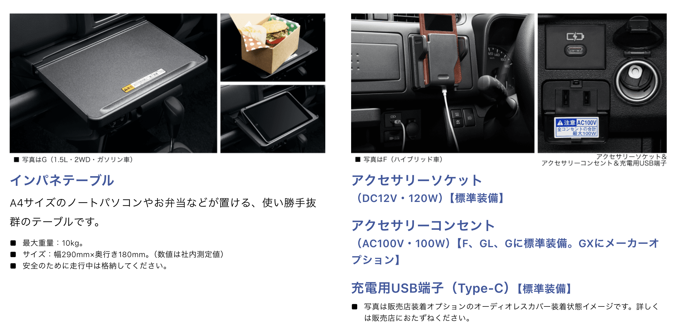 AC100V-100WのアクセサリーコンセントがGXグレードの場合メーカーオプションで12,100円で追加できるので、AC100V-100Wコンセントは付けておいた方が何かと便利かと。普通にパソコンの電源を取れるのはめっちゃ助かるから。